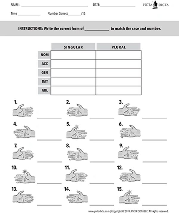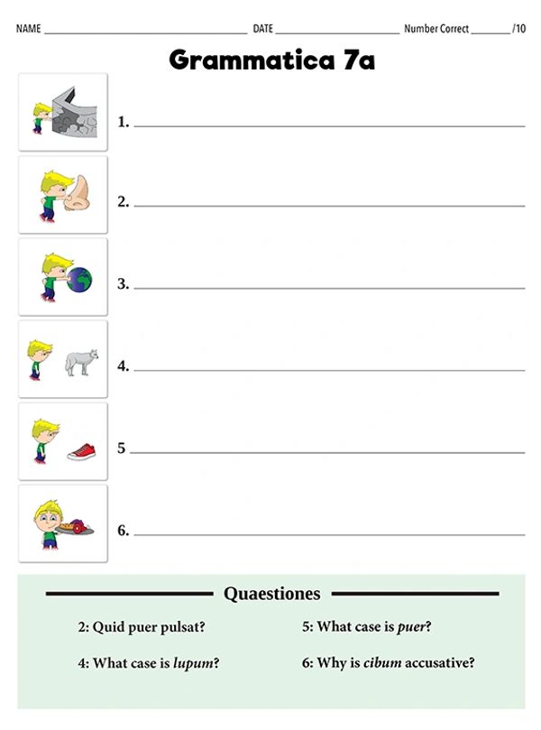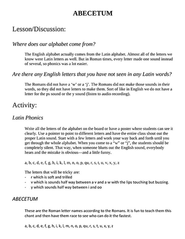 In-class lessons in the Teacher Guide and worksheets make it easy for teachers to introduce all three persons of the present indicative as well as imperative verbs through classroom chants and drills. These exercises lead teacher and students into basic conversational Latin around the classroom.